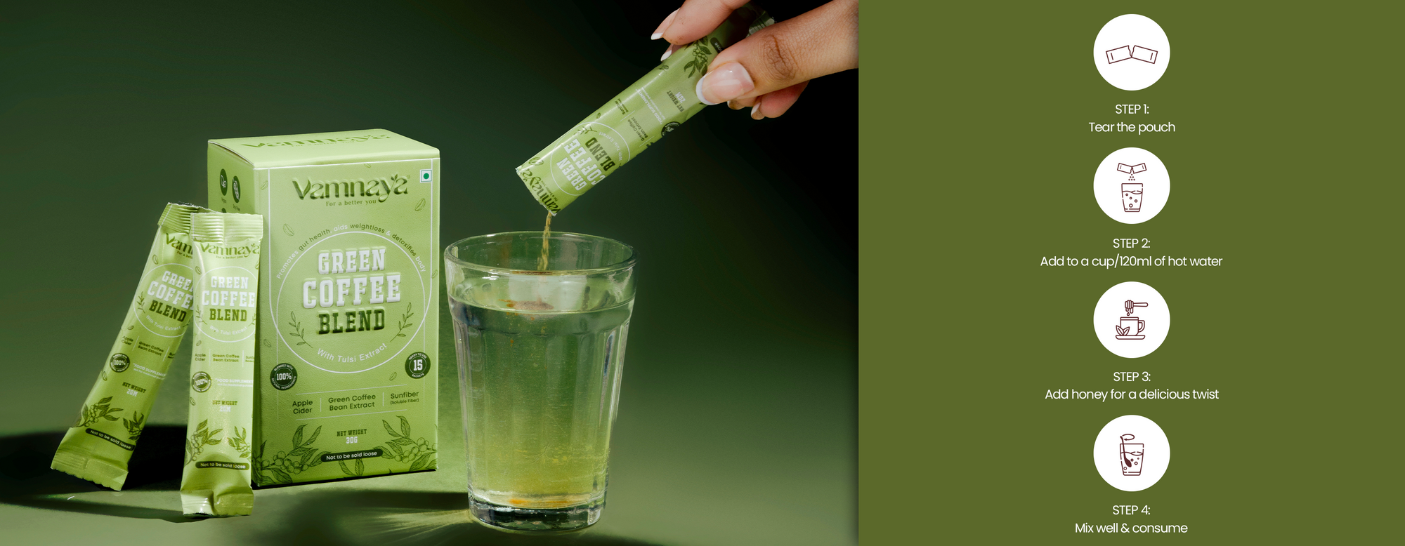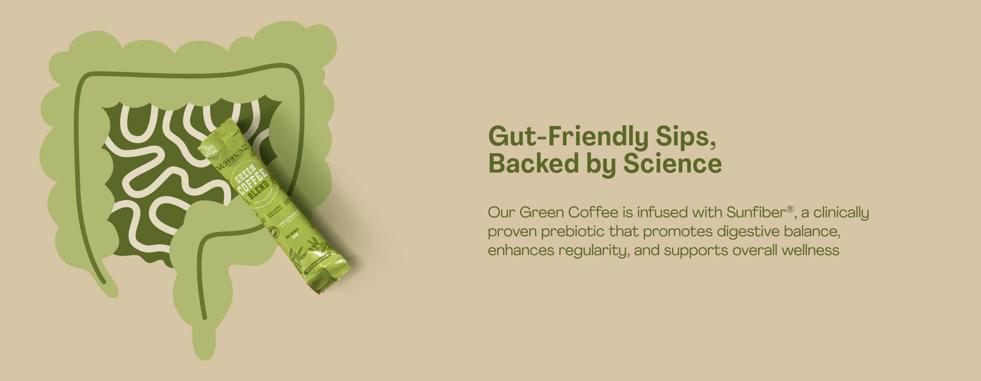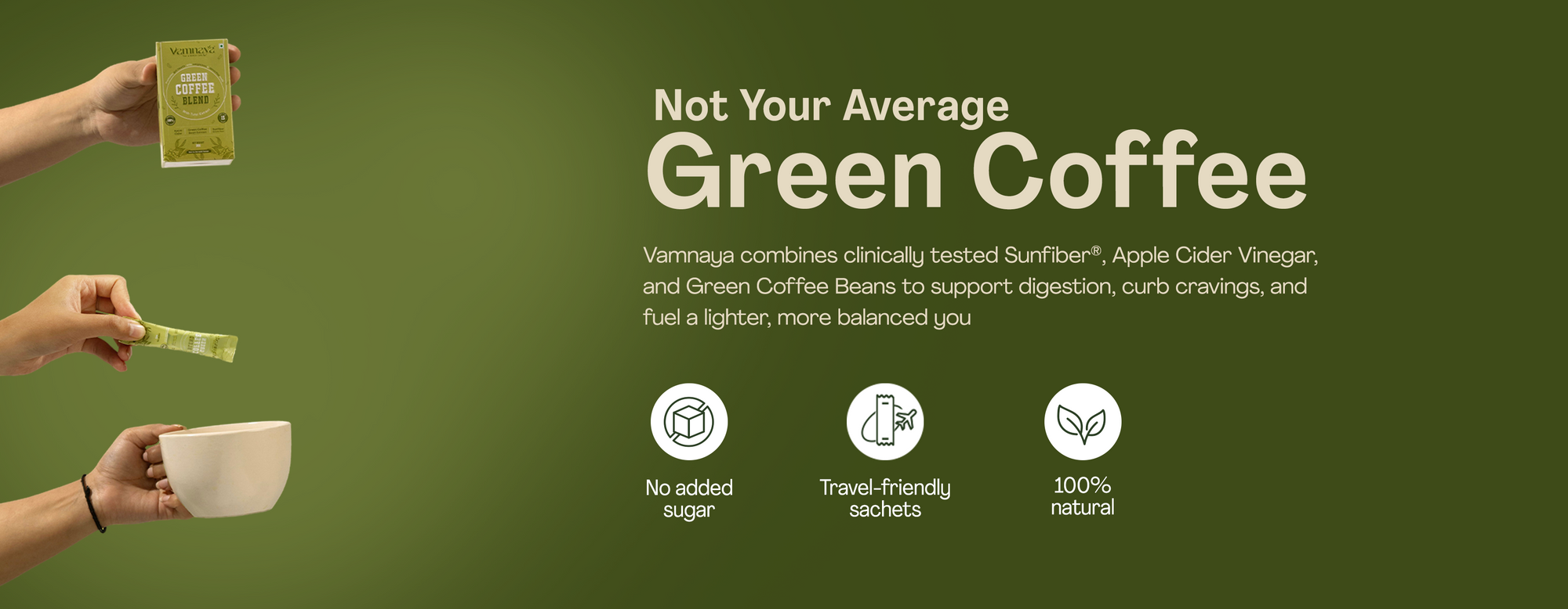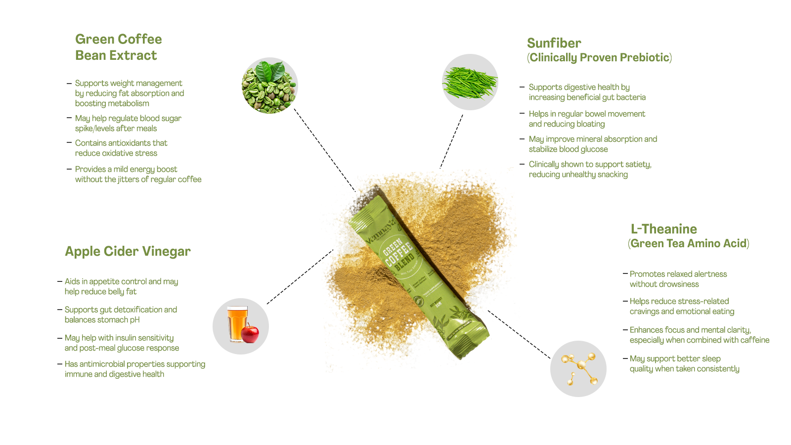 Not just green coffee — each sachet delivers a powerful natural & sugar-free blend of green coffee, lemon extract, apple cider vinegar, L-Theanine, and Sunfiber® (FDA & FSSAI-approved prebiotic fiber).