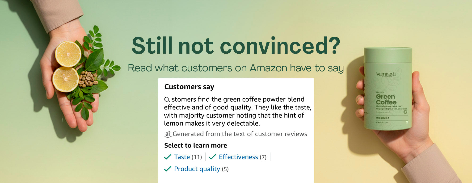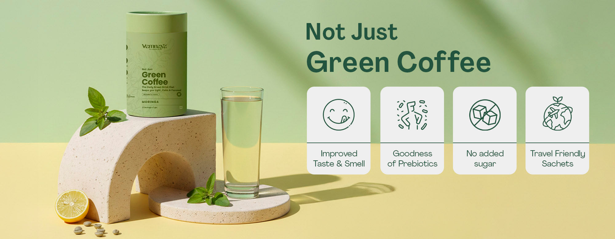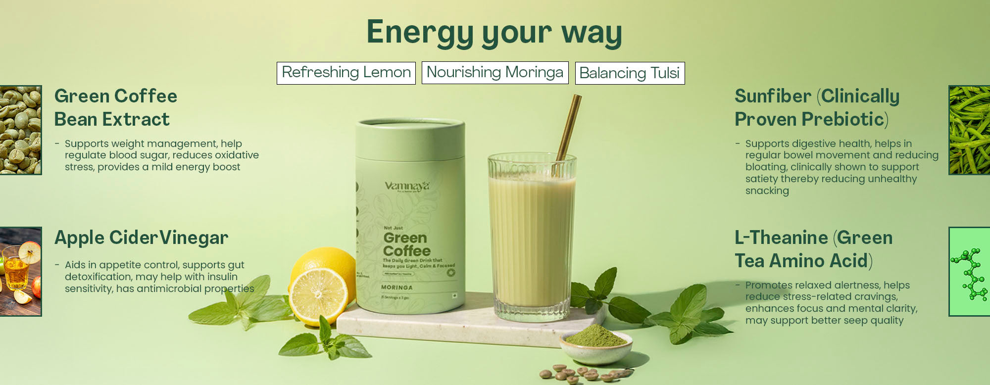 Not just green coffee, each sachet delivers a powerful natural & sugar-free blend of green coffee, apple cider vinegar, L-Theanine, and Sunfiber® (FDA & FSSAI-approved prebiotic fiber) with three extract variants - Lemon with Monk Fruit, Tulsi & Moringa.